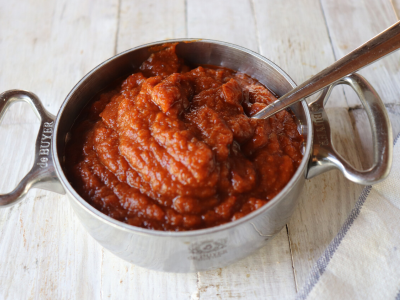 Ingredientes para seis personas. 3 rebanadas de pan duro, 2 cucharadas soperas de almendras, avellanas o nueces de macadamia, 2 cucharadas de postre de pimentón dulce, 1 diente de ajo, nuez moscada al gusto, 2 o 3 cucharadas soperas de aceite de oliva virgen extra, 75 ml de vinagre de vino blanco, 200 ml de caldo de pescado o fumet y sal al gusto.