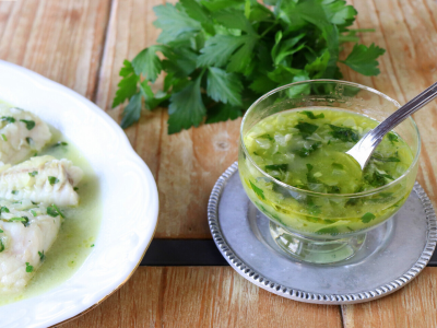 Ingredientes para 6 personas: Un manojo de perejil fresco sin los rabitos, 1 cebolla, 1 diente de ajo, aproximadamente 400 ml de caldo de pescado o fumet, un chorreón de vino blanco, aceite de oliva virgen extra para rehogar la cebolla y el ajo, media cucharada de harina de trigo, sal y pimienta al gusto.